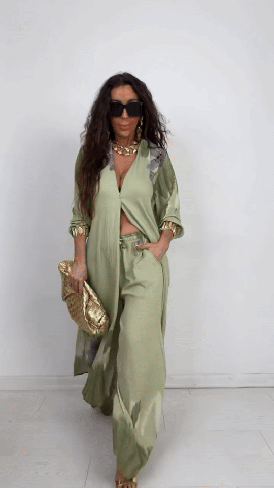 Elegant Watercolor Floral Longline Top Wide Leg Pants Set