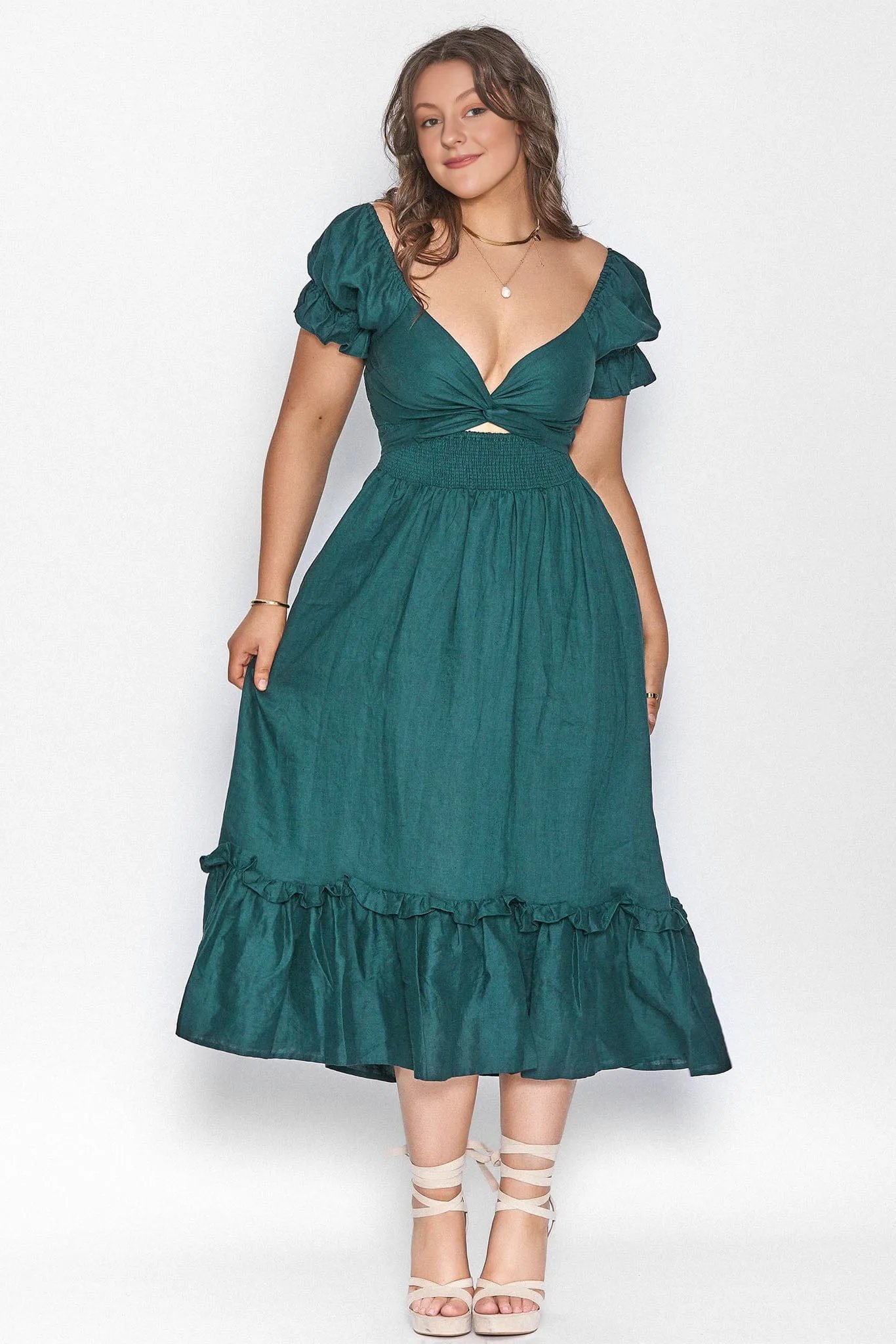 Elasticated shirring for the perfect fit and beautiful A-line skirt that sits. The top is a gorgeous puffy sleeve and the hem is a sweet ruffle design. We love how the ruffles hem gently flutters as you walk.